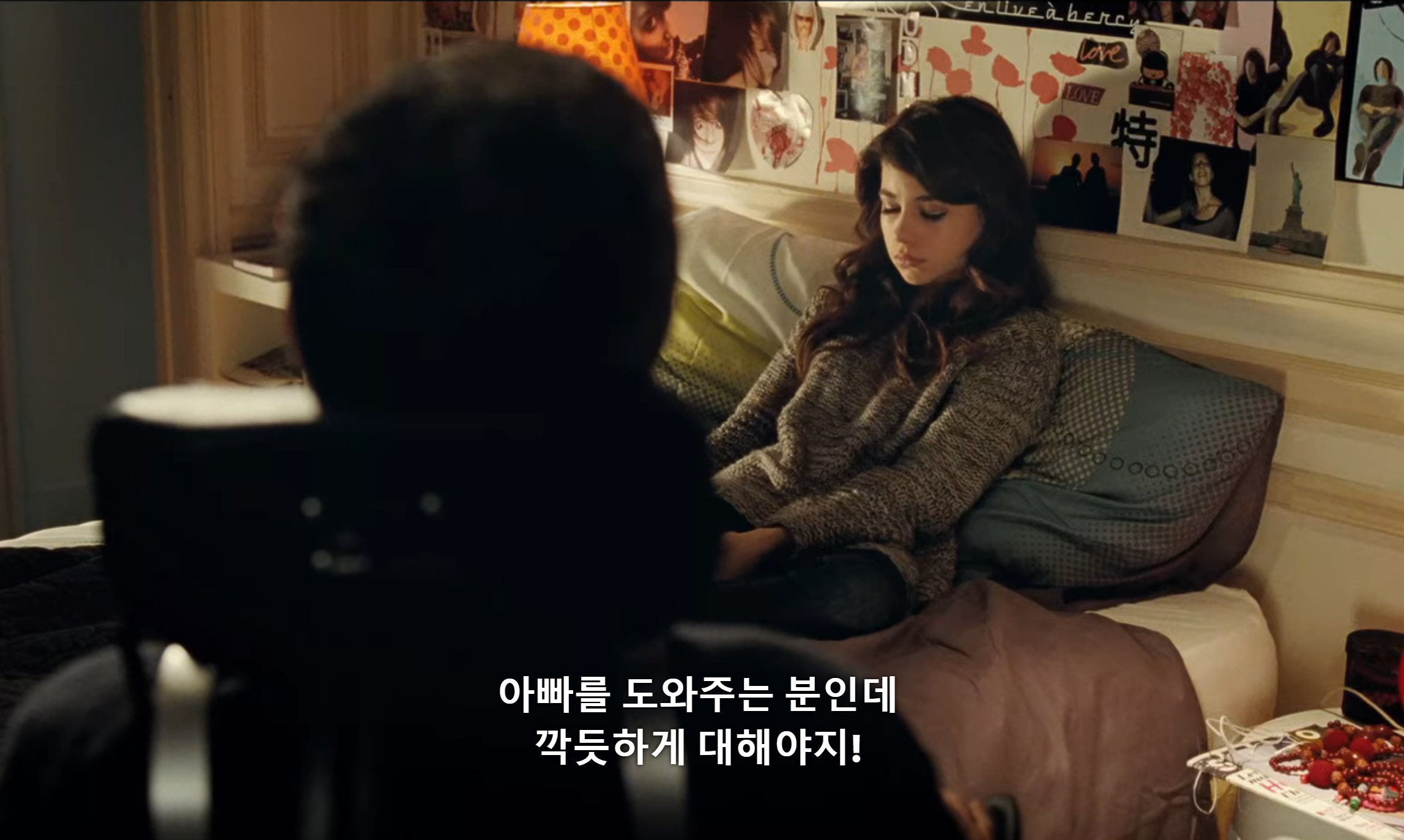 필립은 패러글라이딩 사고로 장애를 겪게된 내용과 아내가 있었지만 사별을 했고 지금 함께 살고 있는 딸 엘리사는 입양을 했다고 밝힙니다. 필립의 생각과 달리 어느덧 반항기에 접어들게 되면서 아빠 몰래 여러가지 사고를 치는데요. 필립 몰래 드리스에게 막말을 하다 드리스의 고자질로 혼쭐이 나기도 합니다.